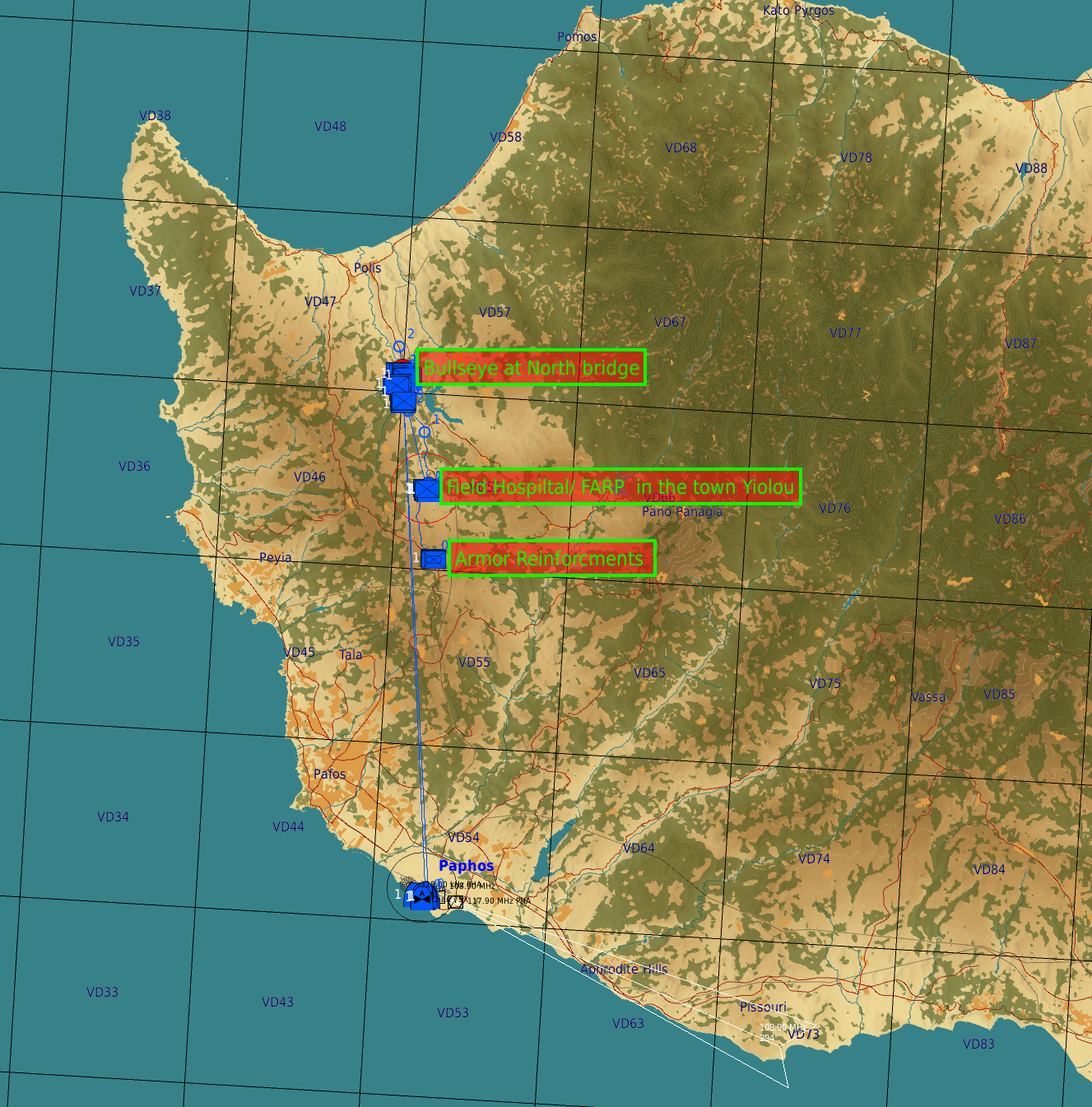 Red forces are advancing south from the town of Polis towards the bridge just south of the town Goudi (North Bridge) . Blue objective is to stop the enemy advance and prevent them from crossing the north bridge (study kneeboard maps) . It is likely the defense will fail due to superior enemy numbers including MBT´s. Blue forces have only light armored vehicles and a single Bradley with ATGM at disposal. Should the enemy cross the bridge next objective is to defend the south bridge located 450m from the North bridge. The terrain will force the enemy vehicles to advance slowly on the road in this area