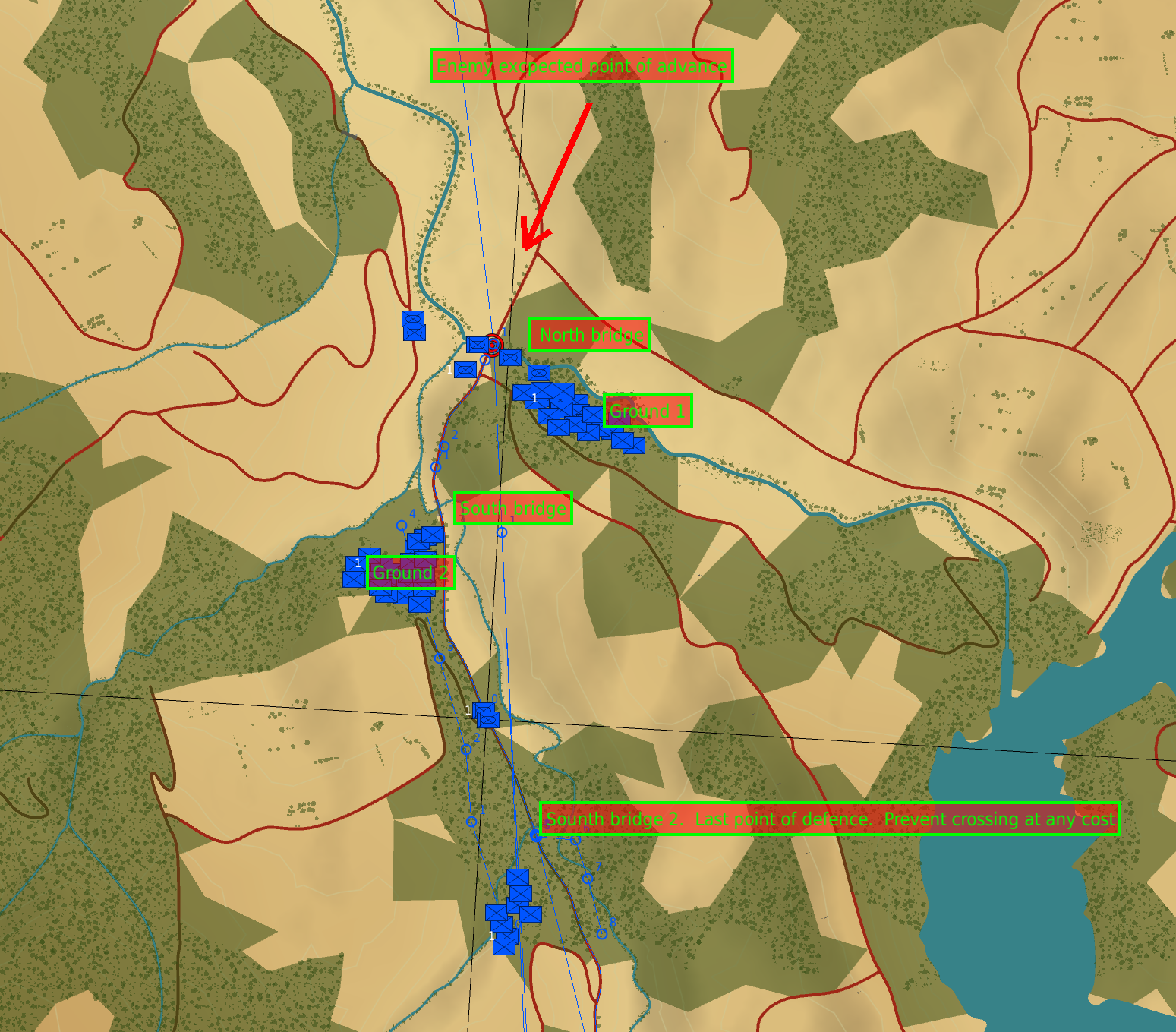 - Secondary objective – In the case the enemy gains control of the bridges stall the advance until our reinforcements have arrived. In last resort blow up south bridge nr2 using the SEAL team to prevent further enemy advancement.