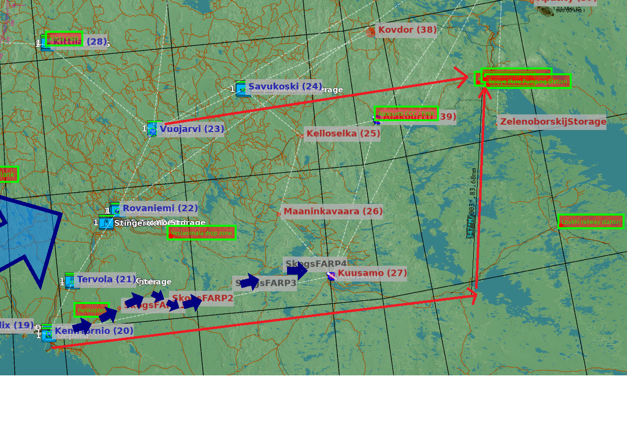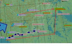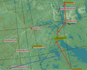 – KEMI TORNIO – skog 60nm öster om KUUSAMO – nordväst till KANDALAKSHA. Längre sträcka med oklart läge vid ZELENOBORSKI.