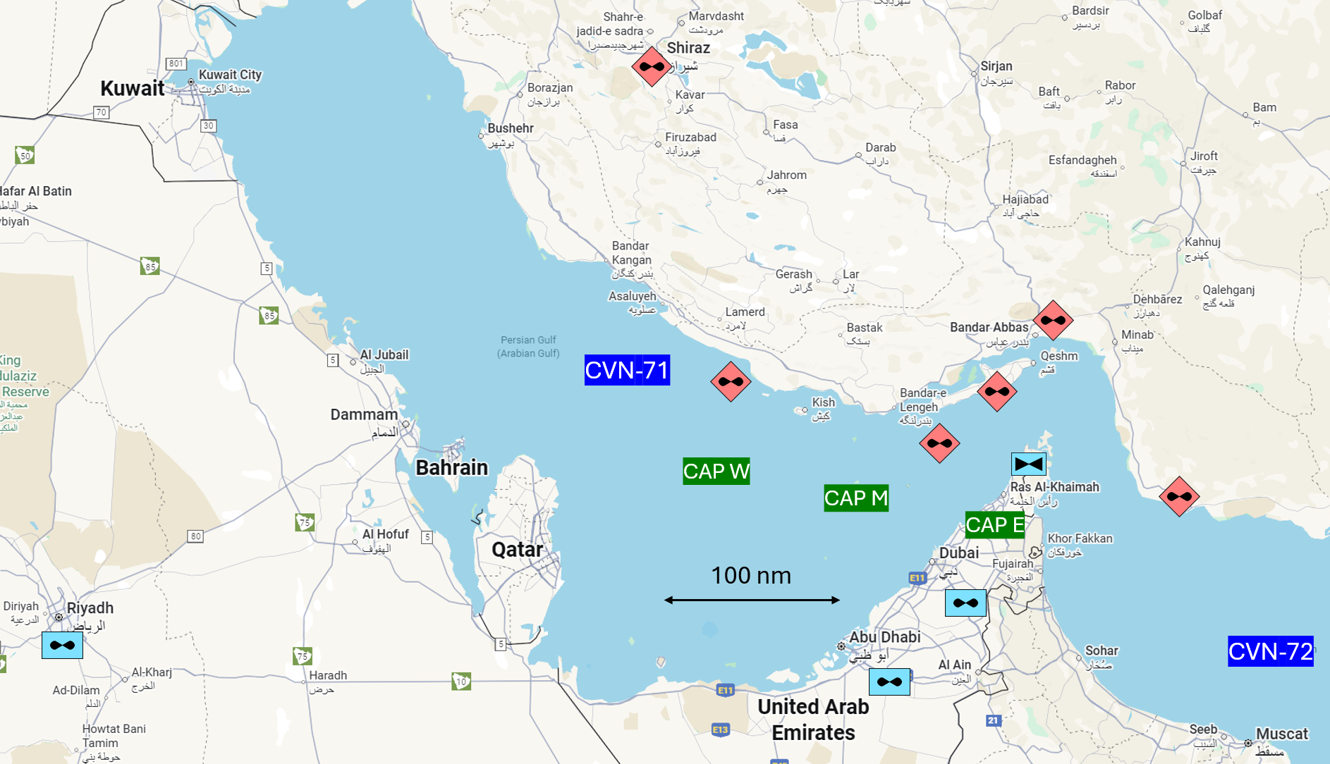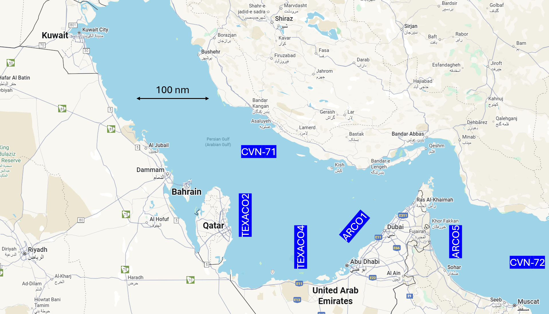 CSG-11 (with CVN-71) west of Lavan island. CSG-9 (with CVN-72) in the Gulf of Oman.