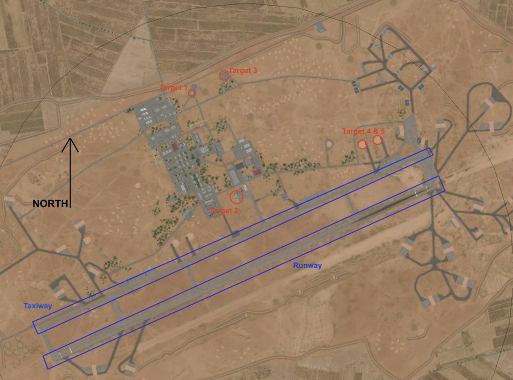 1. F-16 INDY9 will render SA-sites around Al-Dumays airfield inoperable. Report GOODNIGHT when succeeded to neutralize at least the SA-6 sites.