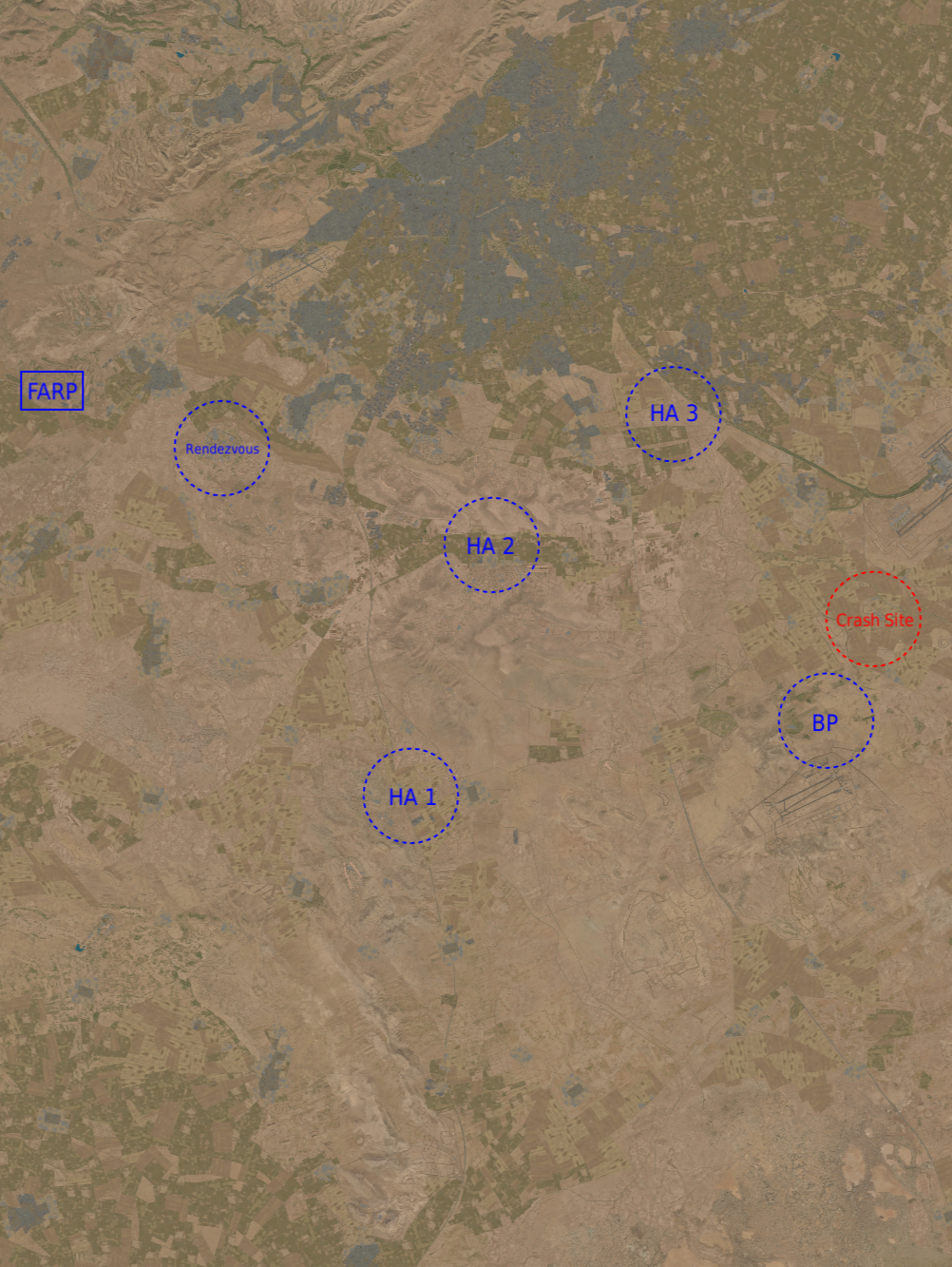 1. Initially one flight infiltrates the crash site and locates enemy forces in the area. Three flights advance to holding area.