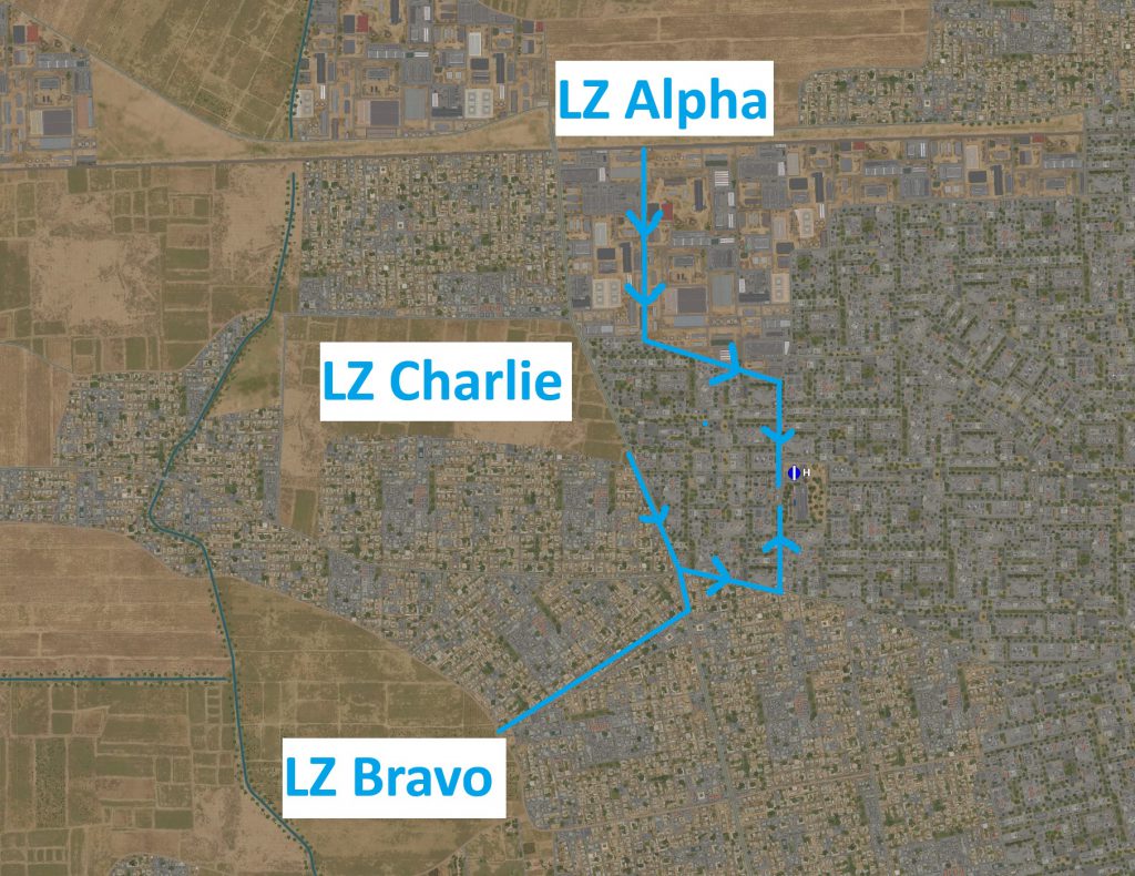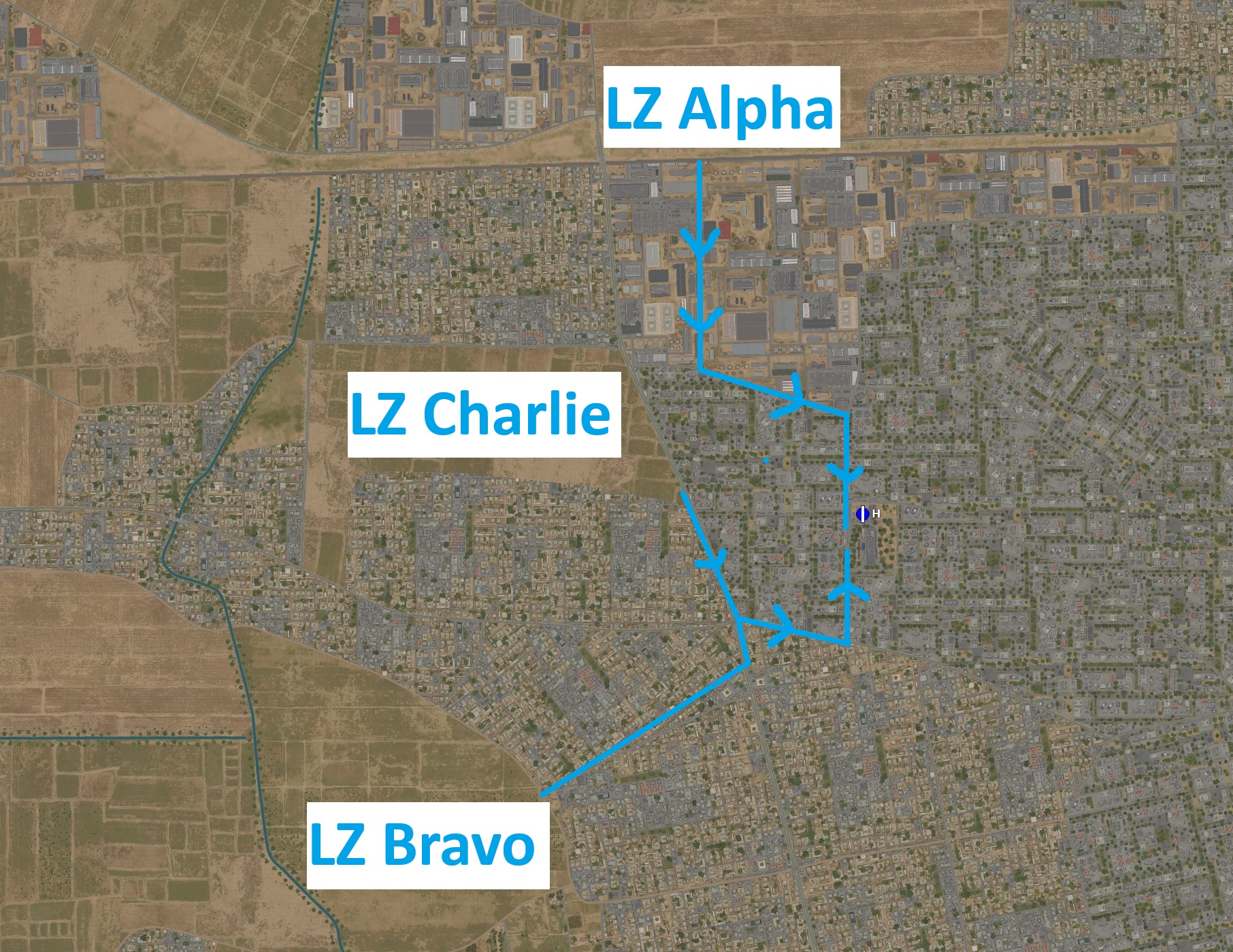 waypoints: 1. FARP 2. LZ Alpha 3. LZ Charlie 4. LZ Bravo 4. Hospital