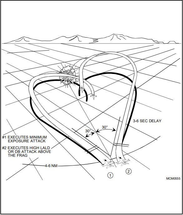 In flights of two, we head towards the target area at high speed and low altitude. Once 5nm from the target, each ship breaks 30 degrees in opposite direction from the target heading. When target is at the 4/8 o’clock position, and on lead call, pop-up and turn into the target. Altitude deconfliction applies. On release, egress opposite ingress heading. At 5nm, disengage heading 300 and fall back into the stack at your assigned altitude. If we get the flow going, we should be able to go 4 rounds, dropping 2x GBU-38 or 2x MK-82 each round. Feel free to switch side and bomb-type between the rounds. Taken from (p.193) https://man.fas.org/dod-101/sys/ac/docs/16v5.pdf