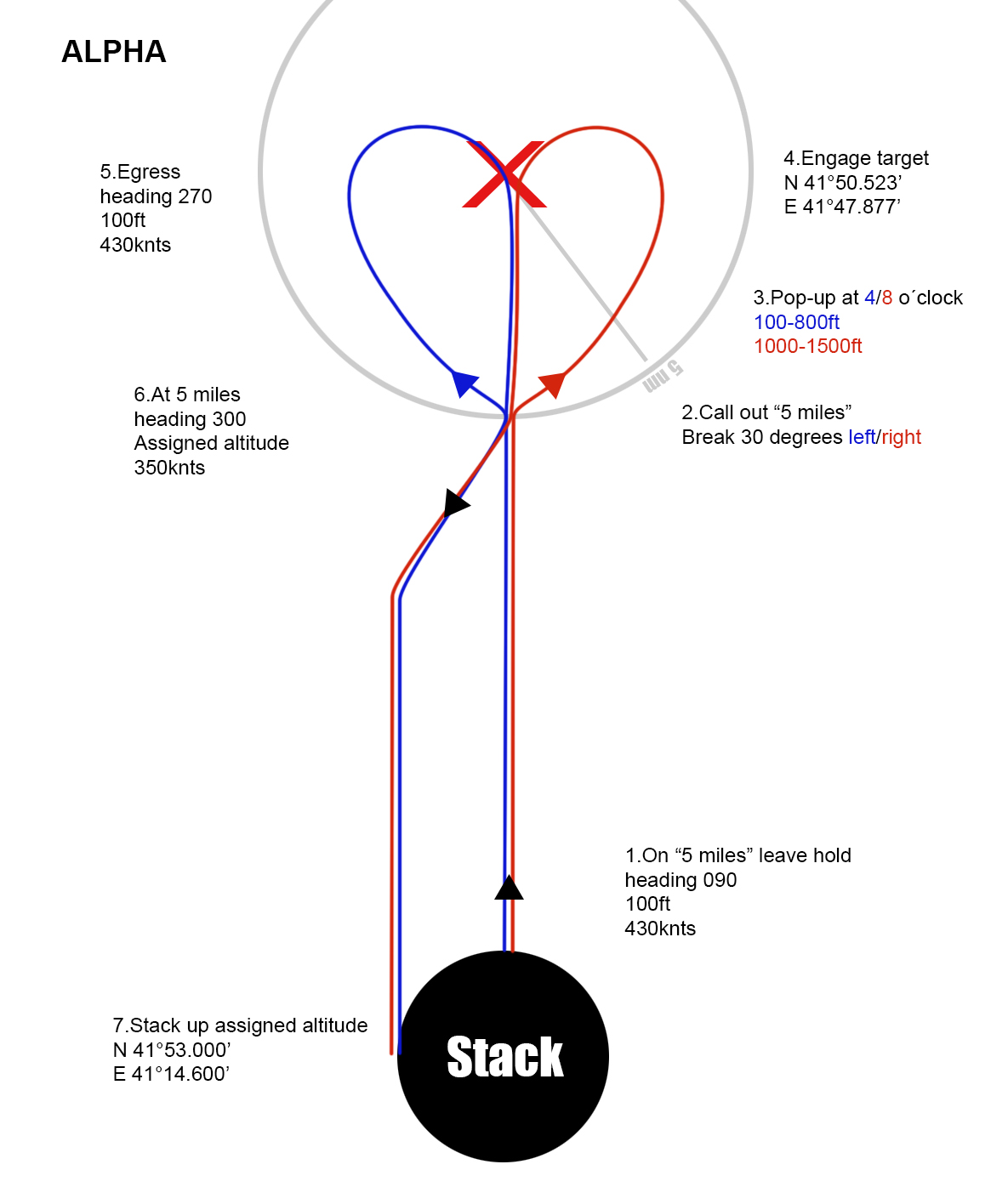 In flights of two, we head towards the target area at high speed and low altitude. Once 5nm from the target, each ship breaks 30 degrees in opposite direction from the target heading. When target is at the 4/8 o’clock position, and on lead call, pop-up and turn into the target. Altitude deconfliction applies. On release, egress opposite ingress heading. At 5nm, disengage heading 300 and fall back into the stack at your assigned altitude. If we get the flow going, we should be able to go 4 rounds, dropping 2x GBU-38 or 2x MK-82 each round. Feel free to switch side and bomb-type between the rounds. Taken from (p.193) https://man.fas.org/dod-101/sys/ac/docs/16v5.pdf